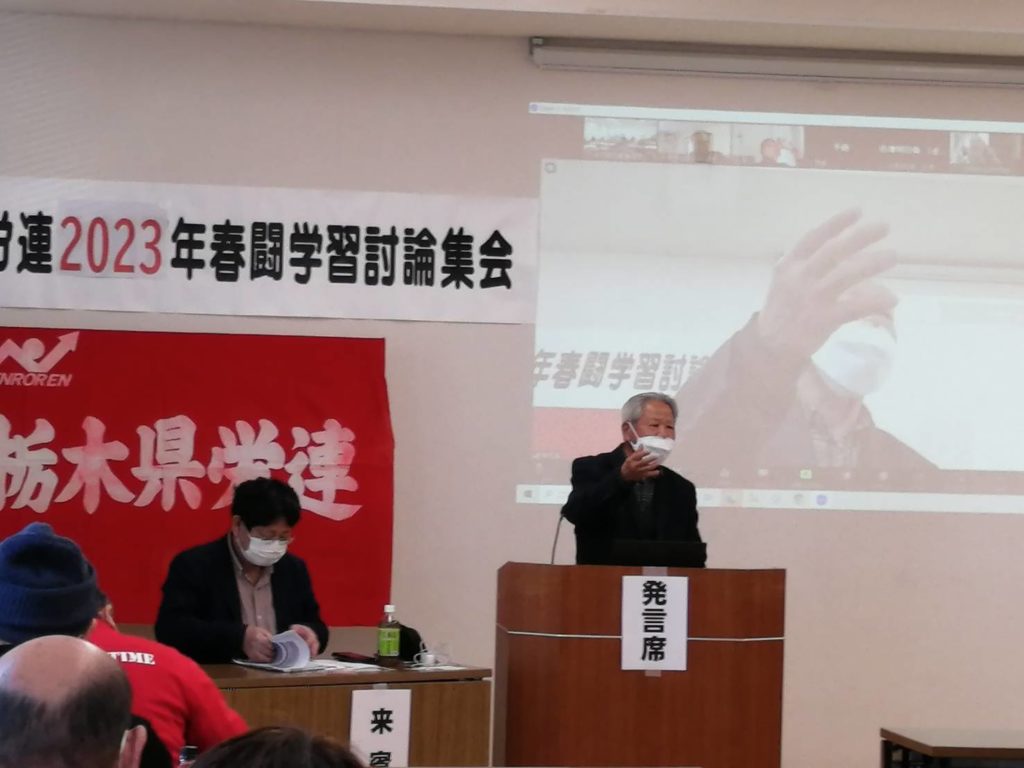 栃木県労働組合総連合(阿波長次議長)は1月21日、宇都宮市内で2023年春闘討論集会を開きました。阿波議長のあいさつ、全労連の清岡弘一副議長の講演、近藤康弘県労連事務局長の春闘方針案の提起をうけ、参加者は積極的に討論に参加し、23年春闘にむけた意気込みを話しました。
