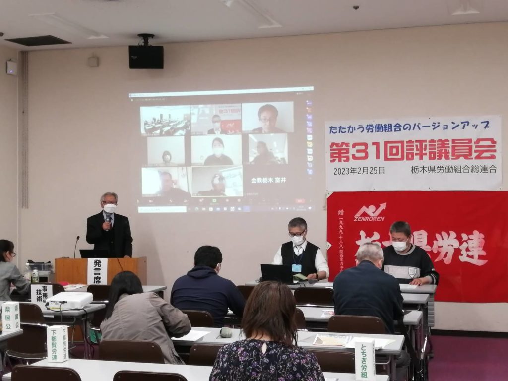 栃木県労働組合総連合(県労連)は2月25日、2023春闘勝利めざし、第31回評議員会(オンライン併用)を宇都宮市で開きました。阿波長次議長は、68年間にわたる春闘の歴史にふれ、「ストライキも視野にたたかいをすすめ、大幅に賃上げを勝ち取ろう」と呼びかけました。評議委員会は2023春闘方針案を出席者全員の賛成で可決し、春闘の高揚をつくるとともに、たたかいを栃木県メーデ(5月1日)につなぐことを誓い合いました。